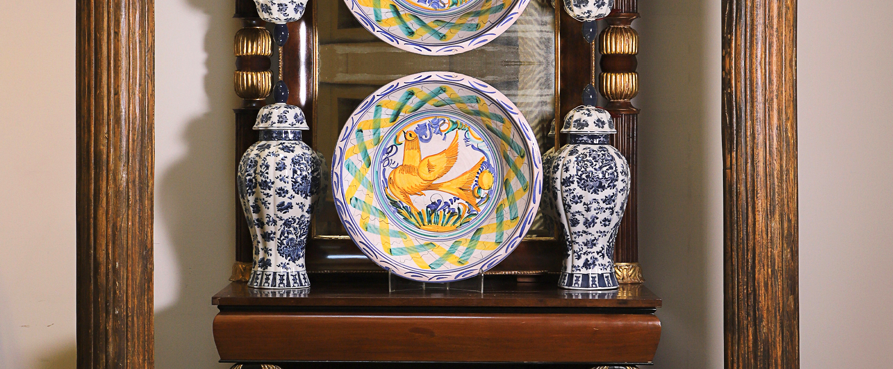 AN ITALIAN SIMULATED MARBLE AND REVERSE PAINTED GLASS INSET TABLE CABINET 19TH CENTURY Fitted with an arrangement of drawers around...